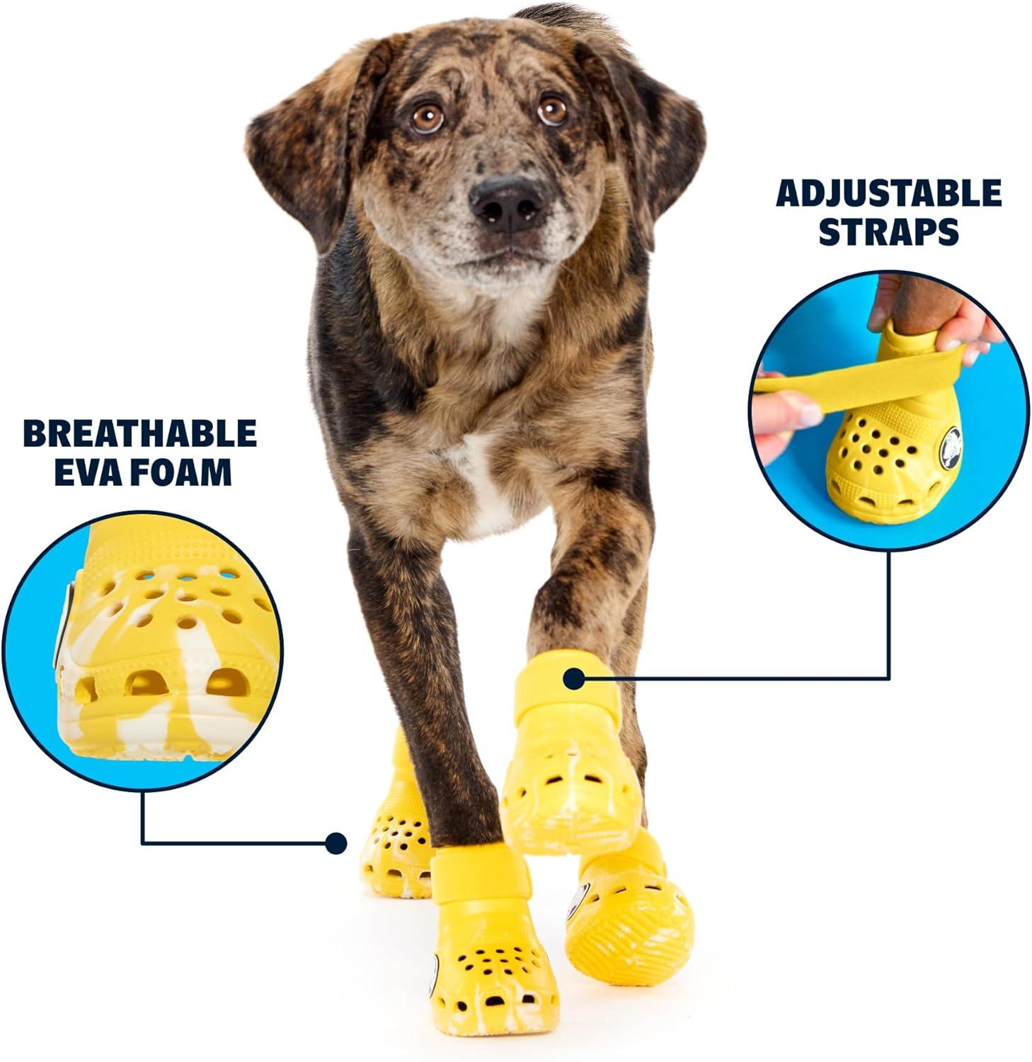 Set of Four Shoes for Full Paw Protection: Each pack includes four matching yellow Crocs-style dog booties, made from lightweight EVA foam with an adjustable strap for a secure, comfortable fit. Perfect for protecting paws during walks, runs, or playtime in every season.